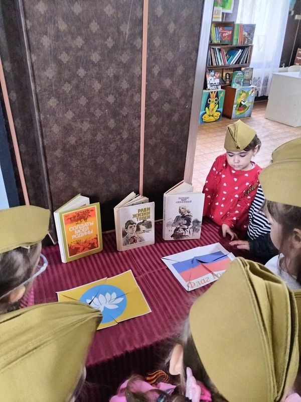 По плану реализации проекта, дети посетили Городскую детскую библиотеку. Работники библиотеки подготовилидля малышей ряд мероприятий: просмотр мультфильма о Великой Отечественной войне, провели викторины, поиграли в дидактические игры по теме. Завершением экскурсии была выполнена аппликация «Вечный огонь».